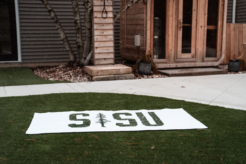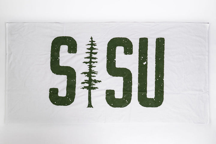 Elevate your recovery with SISU's premium cotton beach towel. Bold green branding stands out against crisp white fabric, delivering the perfect blend of style and function. Sized generously for post-sauna or cold plunge session.