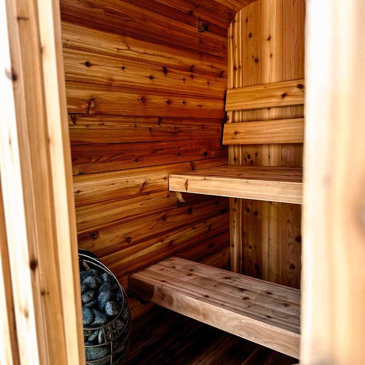 The Charlie Cabin is our modern and compact cabin sauna with room for up to four people that offers a simple way to bring sauna therapy to your daily lifestyle. This cabin style sauna is made of red cedar, requiring virtually no maintenance and giving it an impressively long lifespan.
